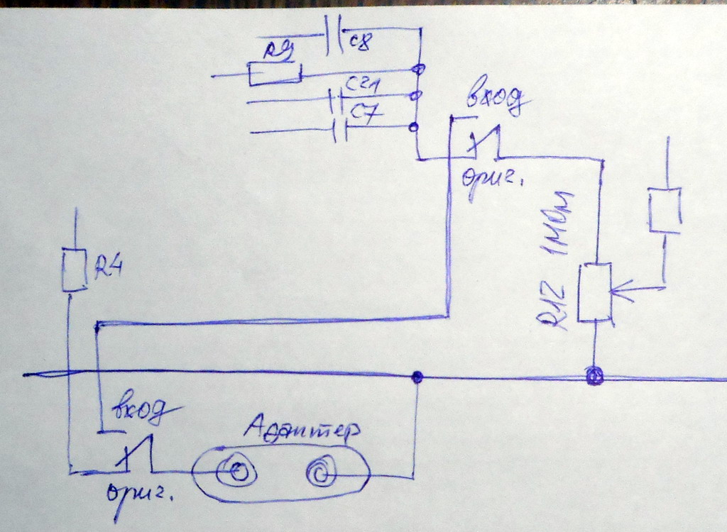 Количество информации к размышлению нарастает. Это хорошо. Тумблер вот такой? Предлагается правый (по схеме) контакт гнезда "АДАПТЕР" оставить как есть, а левый соединить с точкой между С7 и R12? И номинал R12 тогда уменьшать не надо? А второй контакт тумблера тогда зачем? И не проще ли постоянно впаять в эти точки провода и вывести их на отдельный разъём типа "тюльпан"? Всё равно добавлять элемент (тумблер или разъём). А "АДАПТЕР" оставить для первоначального применения.