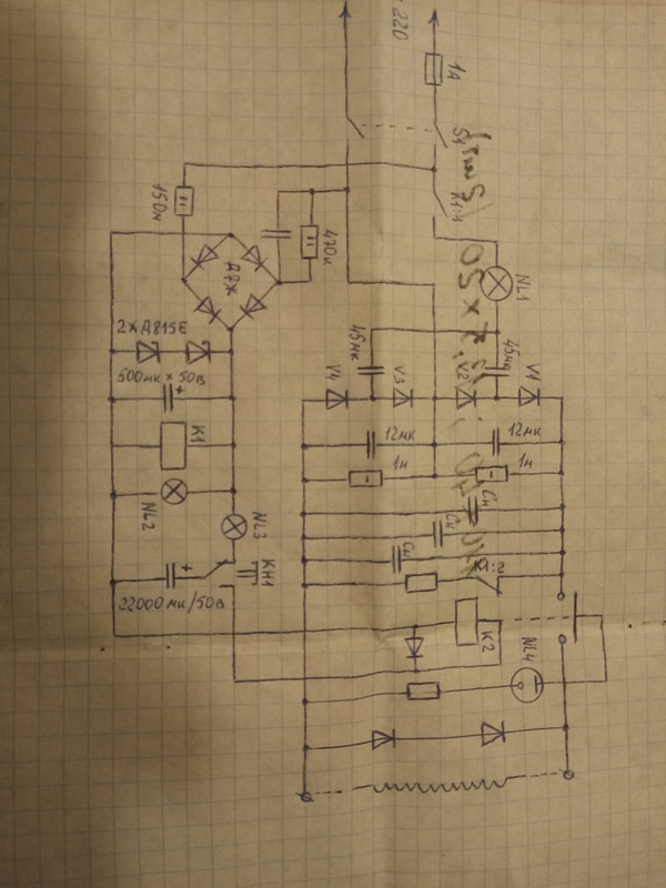 Вот схема. От руки имеет право рисовать не только Бокарев, но и я.. Тумблер S1 заменен на замок с ключом. 1200в уже не бьют, а убивают! По этому важно, чтобы ни кто, ни когда, кроме меня, не включил. Из недостатков, размыкается один сетевой провод, а не оба. Контакты К1:1 исключены из схемы, а их свободно замкнутое положение перенесено последовательно контактам К1:2, для увеличения рабочего напряжения. Реле это РП-2, выполняет функцию разряда батареи накопительного конденсатора. Разрядный резистор в цепи его контактов, два последовательно ПЭВ-10, или 15. Сопротивление точно тоже не скажу. В районе 15 кОм. NL1 баластная лампа накаливания 220в 40-60 Вт (есть обе). V1 - V4 КД226 на 800в обратного (с белым кольцом). Емкости на 45 и 12 мкф, это пленочные емкости умножителя. Cн, это батарея накопительных конденсаторов. Контактор устоен примерно так, как показано на схеме, есть отдельный вывод от замыкающей пластины, его использовал для индикации разряда через неонку NL4, а так-же для контроля на случай если вдруг контакты залипнут и не разомкнутся, добавил параллельно неонке и ее резистору емкость 0,25мкф/1600в, это для того, что время замыкания контактора всего 30-50 миллисек, можно не заметить вспыхивания неонки. Диод параллельно индуктору один. Сперва небыло нужного, вот и нарисовал два. Лампа NL2 - тупо, индикатор питания. NL3 - балластная лампа заряда накопительного конденсатора обмотки контактора. КН1 - кнопка "Разряд" переключает напругу 28 вольт с заряда накопительного конденсатора на его разряд через обмотку контактора. Диоды Д7Ж, на самом деле любые, подходящие, просто у меня был готовый мост на них. Емкость последовательно с этим мостом на схеме не указана, но я помню, что это 5,6мкф. Ну вот. Вроде и все.