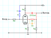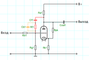 Вы говорите: "... резистивный каскад ОК с делителем напряжения на входе. Сеточный резистор составить из двух последовательных, что бы получить делитель напряжения. В первом приближении 1к15. Сетку подключить к средней точке. Общее сопротивление делителя 500-1000кОм". Если я правильно понимаю, то просто на входе классического усилительного каскада ОК (приведённого в ссылке) перед ответвлением Rc, нужно последовательно включить Rin - верно? При этом номиналы Rc и Rin в делителе входного напряжения должны соотноситься как 15:1, то есть, скажем так: 1М:67кОм. Почему взял именно такие номиналы? Для "жёсткого" варианта анодного повторителя Джон Броски рекомендует номинал Rin=68кОм, а Rc=1М. Для снижения нагрузки на фазоинвертор номинал Rin рекомендуют выбирать несколько больше - 220-330 кОм (само собой, соотношение делителя также будет выше, порядка 1:5 или даже 1:3). Это я к тому, что в предлагаемом Вами варианте входное сопротивление "классического резистивного каскада ОК" примерно такое же, как и в анодном повторителе, предложенном Броски. Верно? И я реально пробовал такой вариант. Очевидна явная перегрузка выходного каскада - явно слышимые грубые искажения даже при совсем небольшом уровне регулятора... То есть, с входным сопротивлением вопрос вроде бы как решили, а вот, что делать с чрезмерной амплитудой сигнала на выходе? Очевидно, именно для этого в схему анодного повторителя, помимо делителя напряжения на входе, введена ещё и петля ООС... Сейчас планирую сделать следующее: 1) В схеме анодного повторителя поставить Rin=300кОм, Rf=390кОм. Эти номиналы ближе к верхней рекомендуемой границе, в рекомендуемом соотношении Rf/Rin=1,3, что теоретически должно обеспечить коэффициент передачи каскада чуть больше "-1" и "разгрузить" ФИ. 2) Затем, отключу выход повторителя от входа выходного каскада и сравню амплитуду переменного напряжения на входе (до Rin) повторителя и на его выходе. Таким образом, проверю реальное значение коэффициента усиления повторителя и фактические значения амплитуды сигнала при подключенном повторителе к выходу ФИ. 3) Далее, отключу вход повторителя от выхода ФИ и измерю амплитуду переменного напряжения на выходе ненагруженного фазоинвертора - сравню результат с предыдущим с целью определения наличия/отсутствия "просадки" при подключении анодного повторителя к выходу ФИ. Если всё в порядке, то уровни сигнала на выходе ФИ и на выходе повторителя будут примерно одинаковы и не будут сильно отличаться от уровня сигнала на выходе ненагруженного ФИ. 4) Подключу вход повторителя к выходу ФИ, а его выход - ко входу выходного каскада и снова измерю амплитуду переменного напряжения на выходе повторителя. Если будет наблюдаться его "просадка", относительно предыдущих результатов, то логично будет предположить, что рассогласование имеет место не по входному сопротивления анодного повторителя, а из-за его слишком высокого выходного сопротивления. И уже тогда, думать дальше... Что скажете? Всё ли я планирую делать корректно? Не видите в намеченных мной мероприятиях никаких "подводных камней"?
