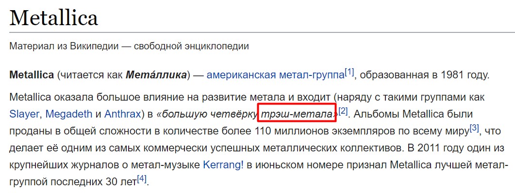 "Никогда не читайте советских газет перед едой!" (С)-Профессор Преображенский. "Никогда не читайте Википедию на ночь"- мои рекомендации. Jaster, эта, харе подкалывать! А если серьёзно, то "трешевых" вещей у Металлики раз-два и обчёлся. Хотя о чём это я... Что есть треш? Вы знаете? Я нет. Раньше проще было-в бочку чехлов насовали, что б повыше да посуше, фузяку накрутили по верхам, что б уши резало, большому таму мембрану распустили, что бы с просероном звучок, на рабочий барабан под струны чё нить подсунули, что бы по башке долбило. Так: ударнику-две минуты на 16-х продержаться до судорог, бас гитаре одна нота, максимум три, главное с бочкой не разойтись, лидеру-струны не порвать, вокал-погромче, пострашнее и понепонятнее... Всё поехали, пипл хавает, ногами дрыгает, глаза закатывает, а если ещё и стробоскопчик в довесочек, а поближе к коде уже ногами дружно топают, перекрытия трясуться... Всё... вещь удалась А называлось это просто - "забой"... А Вы треш-треш.