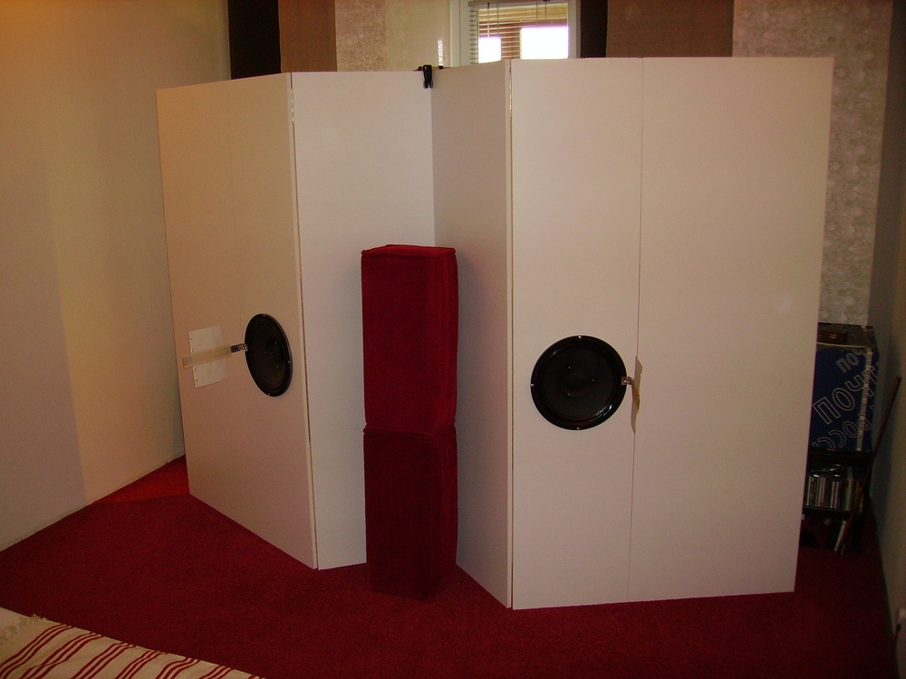 Александр, спасибо! Да, действительно 2-ой этаж мансардного типа 6х5 м, ломаный потолок, высота в холке 4 м, стена вдоль которой всё планируется примерно 13 кв.м. Любимый 6ГД-2 (вынут из Симфонии 2) Блестит, потому что пропитка хорошо сохранилась и от вспышки. Вот что получилось в месте прослушивания: