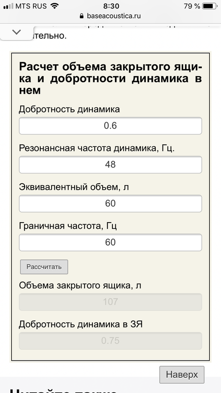PS: По расчёту ФИ играет 45-50Гц, а на слух лучше ЗЯ от 70-80Гц...