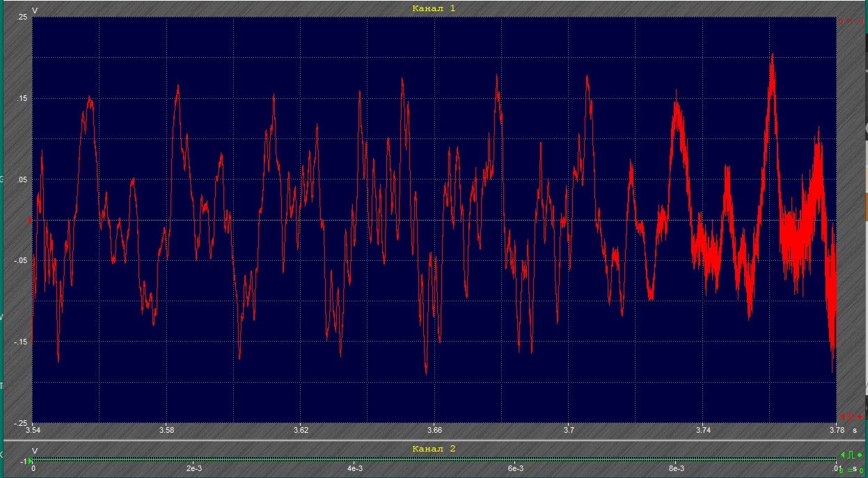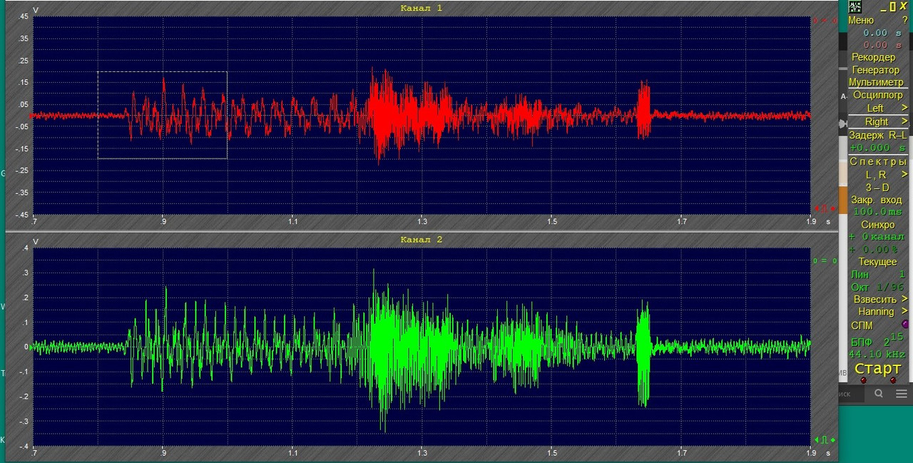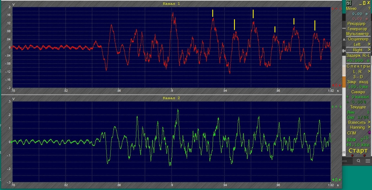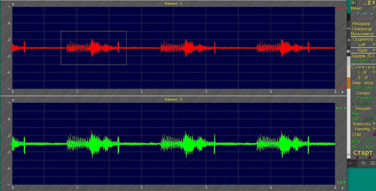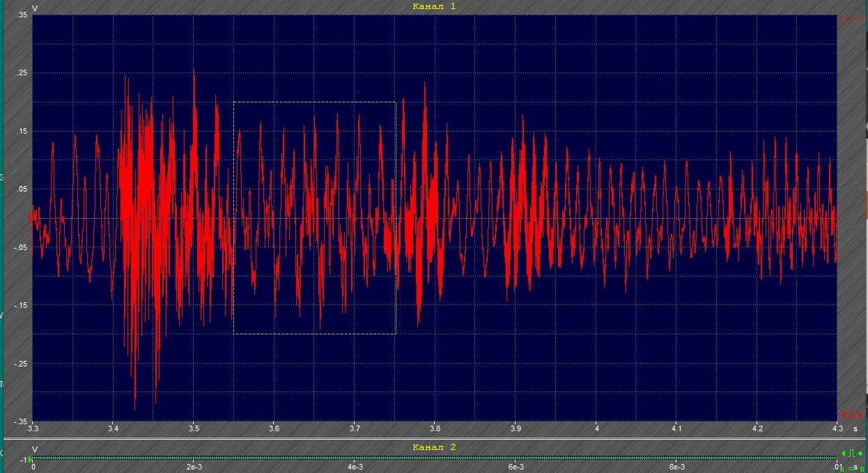 Здесь в красном канале выход с ЦАПа, в зелёном - микрофоном у динамика Интересующий нас фрагмент в белом квадратике