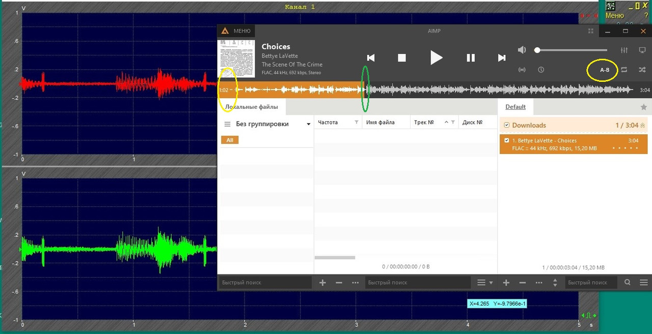 Итак: запись Выделил в фонограмме участок примерно в секунду 1:02 - 1:03 (на скрине зелёный овал) кнопками А и В