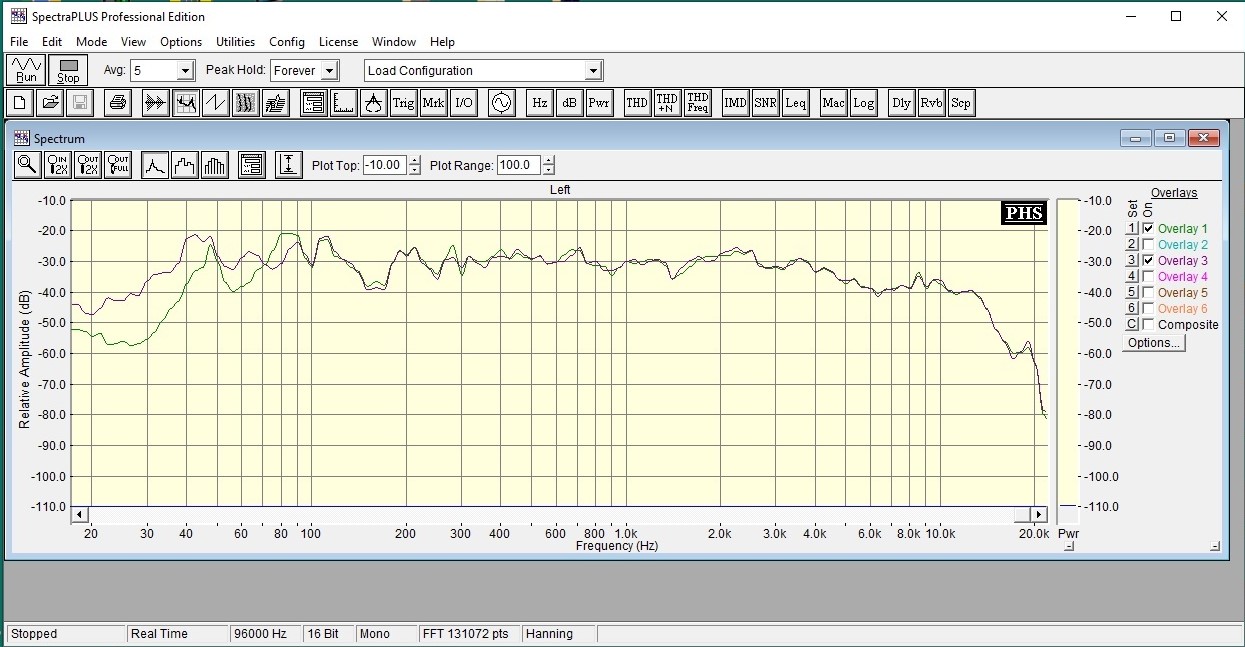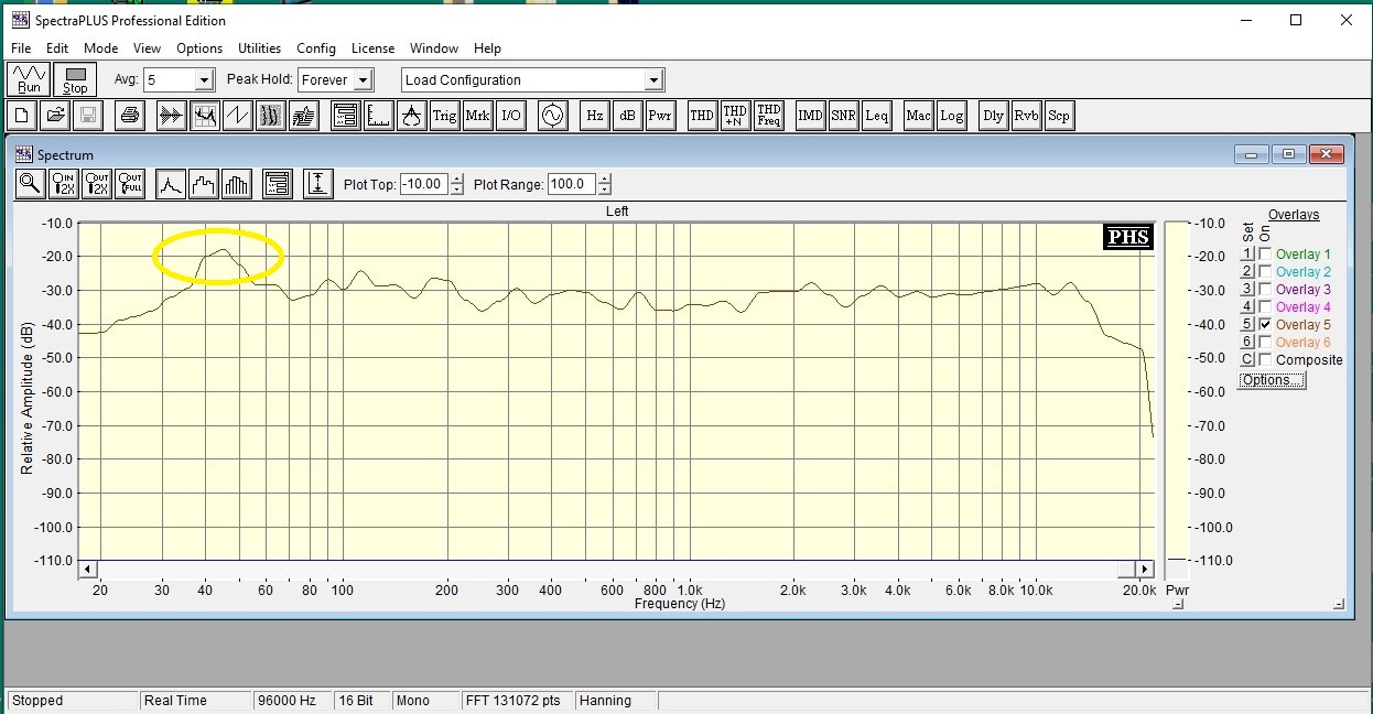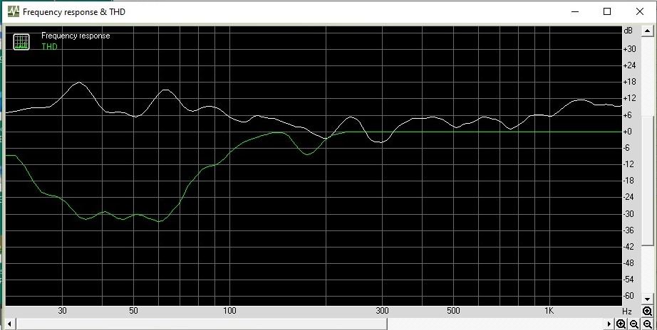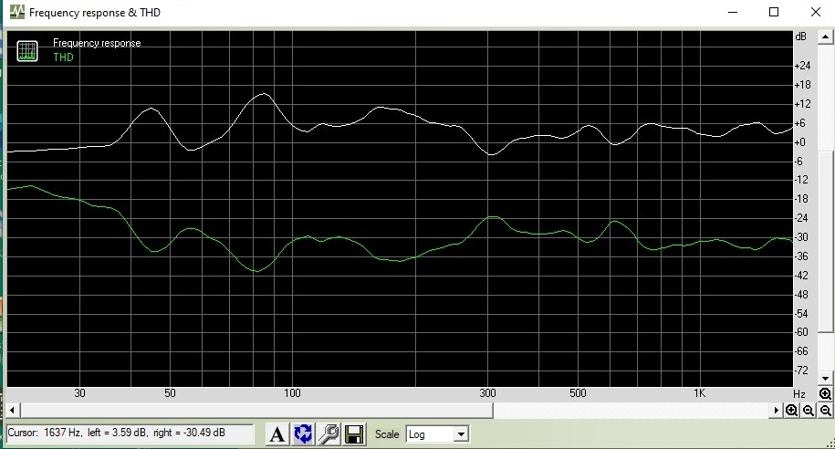 Один из вариантов Записал файл одиночных частот от 33 Гц до 500 Гц от генератора изменяя частоту мелкими значениями (каждая частота длительностью несколько секунд, чтобы всё устаканилось) Воспроизводил Фубаром, частота раздела 110 Гц (не уверен, не записал в имени файла, но около того) Смотрел Спектрой в режиме накопления, микрофон в ТП