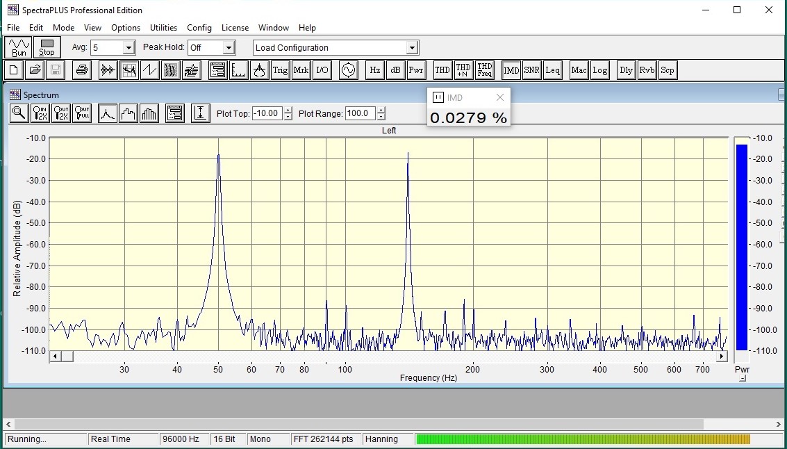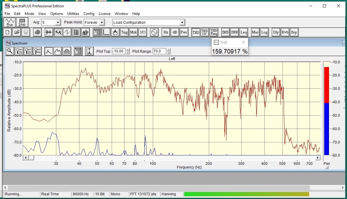 Спектраплюс есть, но мне нужен музыкальный файл (mp3 или подобн.), чтобы запустить его Фубаром, а в Фубаре есть возможность разделить на полосы и вывести на разные выходы Хочу посмотреть близкие частоты при разделении Допустим, частота раздела 90 Гц, если на входе 50+140, то на один динамик пойдёт 50 и ослабленные 140, а на другой пойдёт 140 с ослабленными 50 Интересны гармоники, интермодуляция, фаза в точке прослушивания
