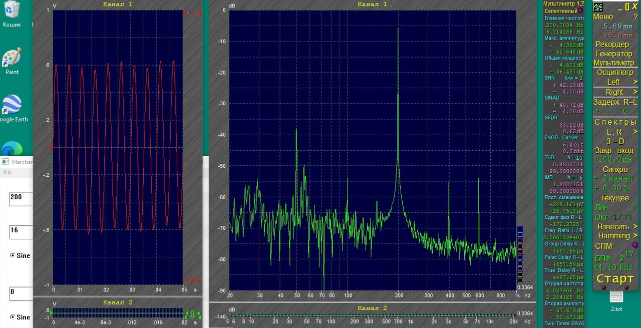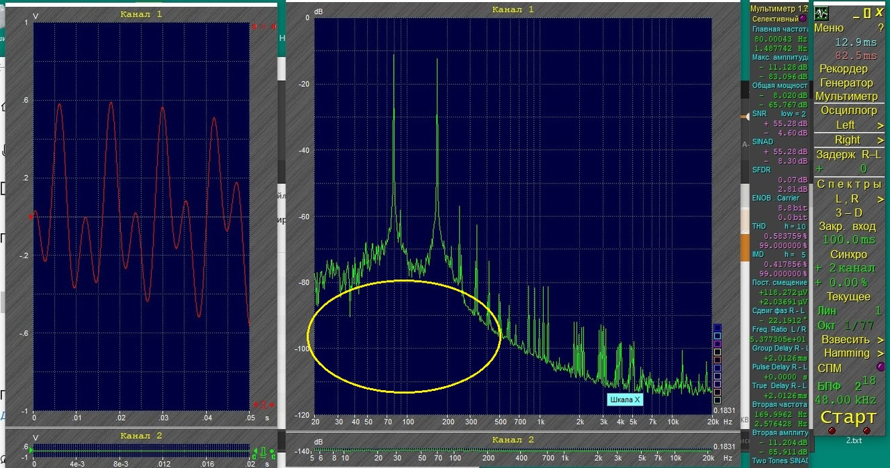 Доработал звуковуху, записал несколько разных файлов через Спектру Это 50 Гц + 140 Гц, звуковуха сама на себя (на микрофонный вход)