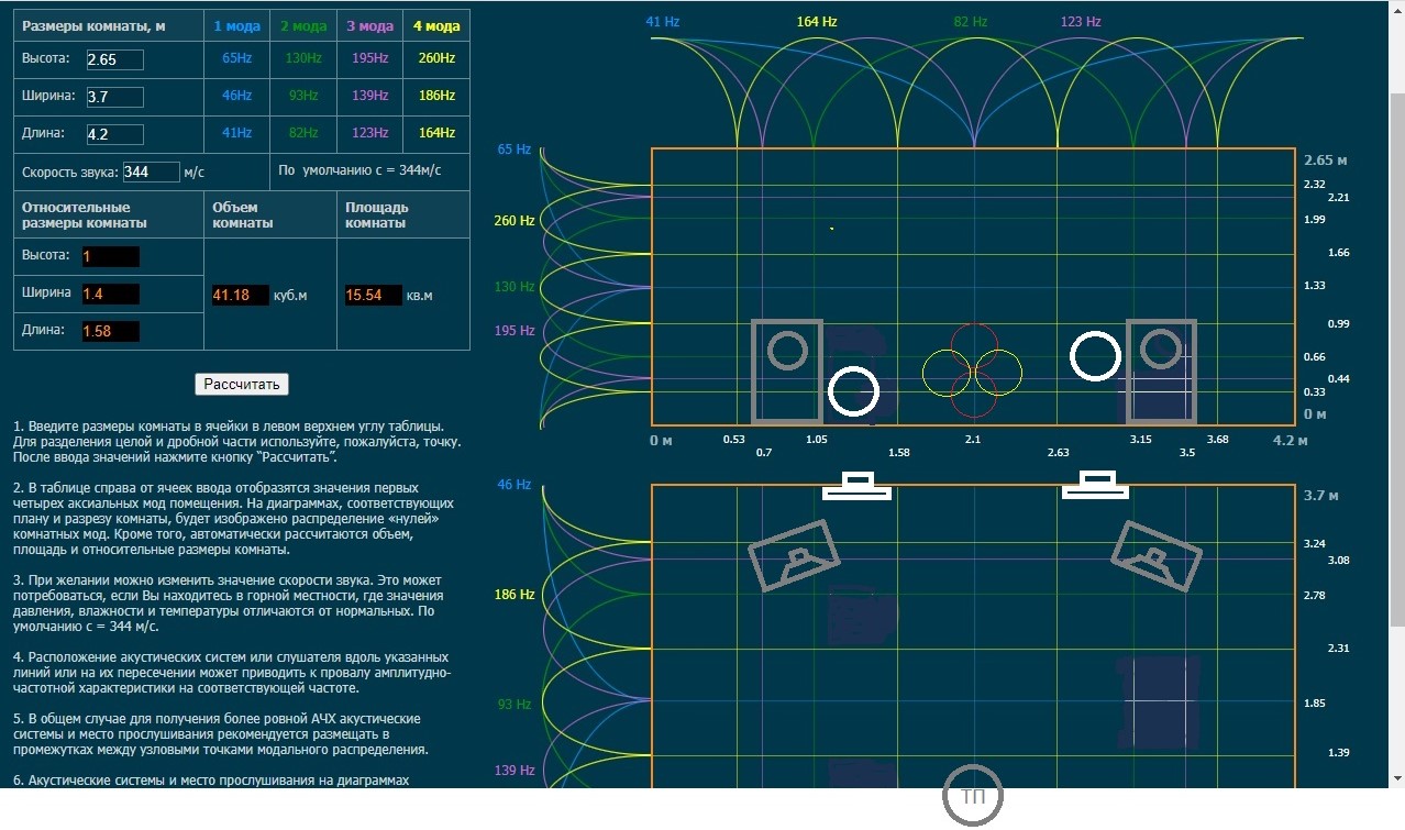 Есть желание сделать 2.1 С источником не определился, т. к. пока не могу попробовать программно выделить НЧ канал (Jriver не устанавливается на ноутбук) Для кино сейчас пользую С-90 без фильтров и без СЧ-ВЧ. Стоит в углу и даже при малой мощности довольно неплохо ухает, но для музыки это не подойдёт Потягал её сегодня по комнате, подавая тоны от 30 Гц до 100 Гц и посмотрел смартфоном с Spectroid Оказалась довольно интересная картина: из разных мест возбуждения на разных частотах в точке прослушивания были разные результаты, моды по-разному себя проявляли (во закрутил... ) Есть предположение, что с несколькими сабами будет лучше Ещё момент: звук НЧ с ФИ и с ЗЯ не нравится, есть возможность воткнуть НЧ динамики в стену Отсюда вопрос: где их лучше разместить? Пока только о месте. Тип динамиков, усилитель, частота и способ раздела - позже Это план комнаты. Точка прослушивания и колонки показаны серым, возможное место установки двух НЧ - белым, красным, синим