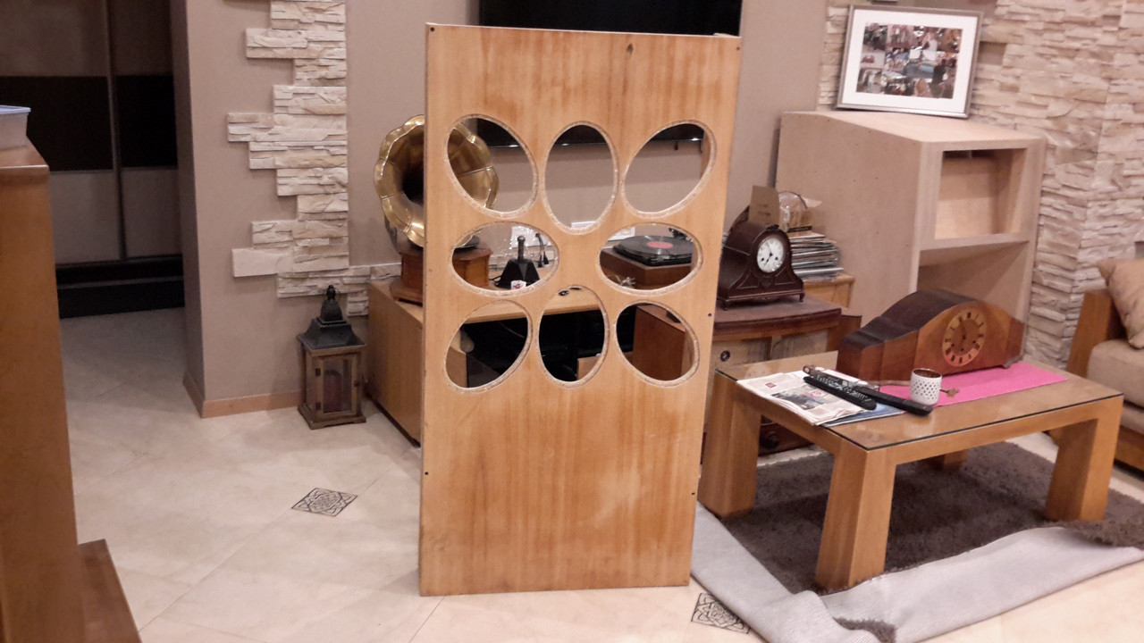 Начинаю делать недоГИ из старого стола, 8 динамиков 5гд-1, считаю их одними из музыкальных шириков , уступая 2..3 динамикам времен ссср. Полное ГИ как 12..16 или даже 20 динамиков не хочу и не хотел никогда. Да и достать 5гд-1 не так легко и чтоб целые еще былиб. А вот цветок зла такой, попробовать это да. Цветок подсказал сделать уважаемый АБ. Сравнить с 2а11 по низам, в этом была идея, площадь 8 динамиков в 2,5 раза больше чем у 18ки. И посмотрим сможет ли этот щит с боковыми крылушками отыграть в полочку 40гц как и 2а11, да и вообще что такое когда играет хор зайчиков мальчиков. Сегодня вклею динамики и соединю их последовательно, завтра замерю ачх и может воткну еще вч динамик в пестик или тычинку, посмотрим.